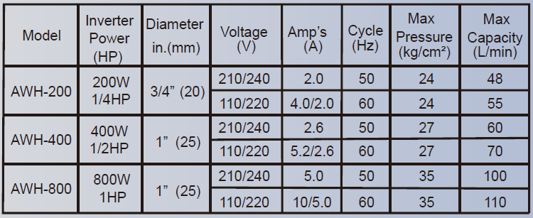 AWH là dòng sản phẩm bơm tăng áp nước nóng all-in-one, tích hợp động cơ, bơm, ắc quy, thùng áp suất và hệ thống cảm biến áp suất nhỏ gọn với bộ điều khiển CPU vi tính nhỏ. Sản phẩm AWH có hiệu suất tốt hơn so với hệ thống sưởi thông thường. Dòng bơm AWH còn có chứa hệ thống kiểm soát mực nước chính xác hơn và máy bơm nước êm nhẹ hơn nhiều so với các loại bơm thông thường khác.