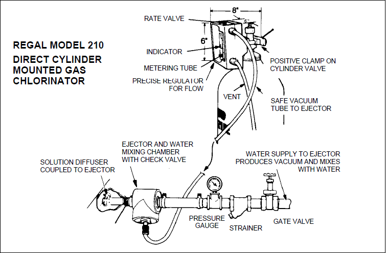 REGAL Model 210 Chlorinator là loại cấp liệu giải pháp vận hành bằng chân không, được thiết kế để gắn trực tiếp vào một van hình trụ clo bằng phương tiện của kẹp ắc quy nặng. Tốc độ dòng Clo được điều chỉnh theo cách thủ công và được điều chỉnh bởi bộ điều chỉnh cơ hoành đối diện với lò xo cũng có van ngắt an toàn. Chân không được cung cấp bởi một vòi phun hoạt động bằng nước hiệu quả cao, được kết hợp cùng với bộ khuếch tán dung dịch clo. Bộ phận phun có chứa van kiểm tra dòng chảy ngược.