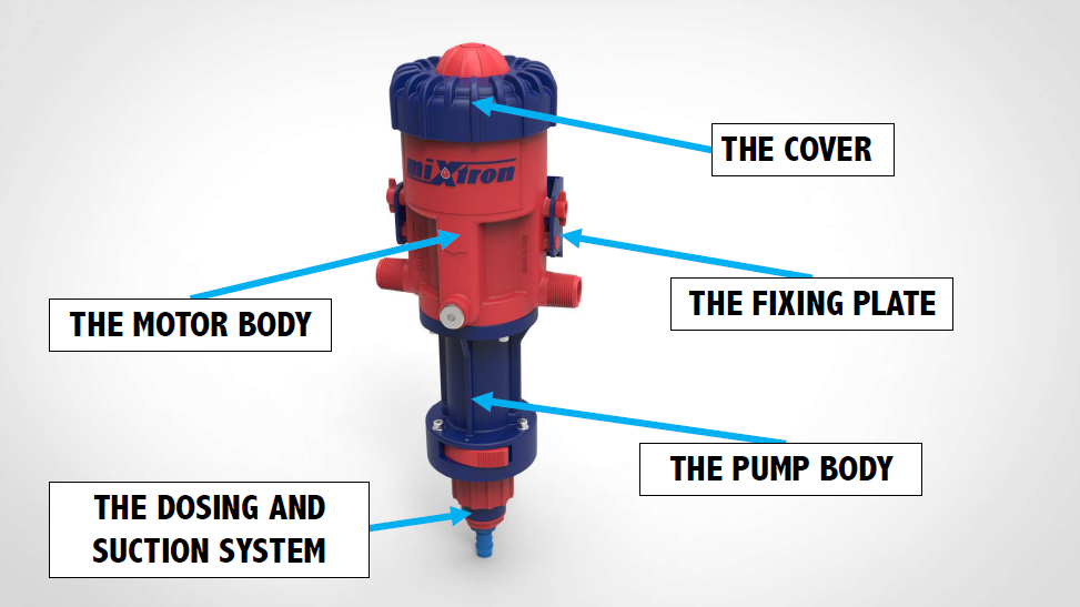 Cấu tạo bên ngoài của máy trộn hóa chất MIXTRON cực kì đơn giản, bao gồm: vỏ máy, thân motor, tấm chắn, hệ thống hút và định lượng, cuối cùng là thân máy.