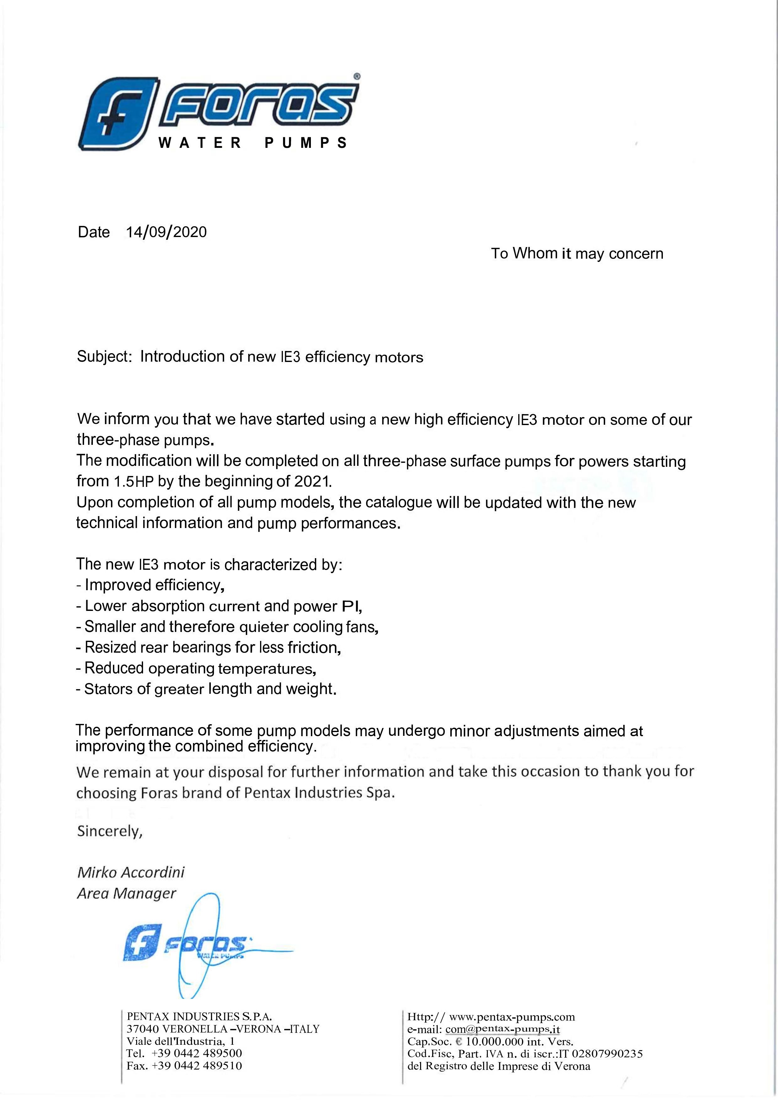 Việc thay đổi động cơ IE3 sẽ được áp dụng lên toàn bộ máy bơm Foras với công suất từ 1,5 mã lực vào đầu năm 2021, và sẽ thí điểm ở các sản phẩm Foras dòng MN-Series. Sau khi hoàn thành việc thay đổi này, tất cả các danh mục sản phẩm sẽ được cập nhật với thông tin kỹ thuật và hiệu suất mới.