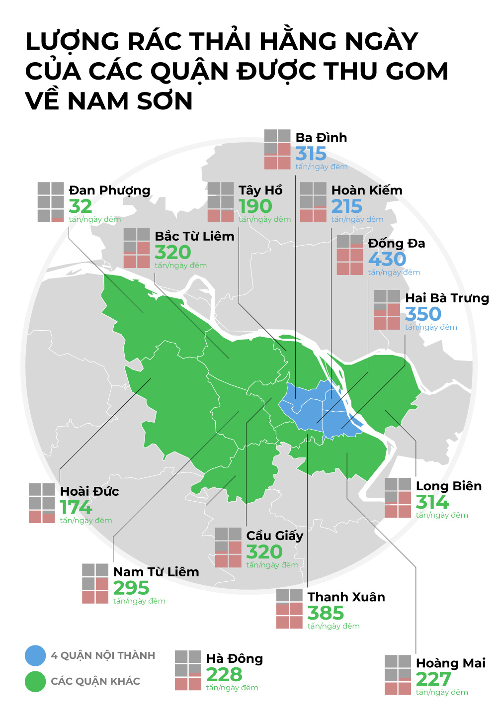 Báo cáo kết quả giám sát việc thực hiện công tác quản lý chất thải rắn sinh hoạt của Ban Đô thị, Hội đồng Nhân dân (HĐND) TP Hà Nội năm 2019, cho biết, Hà Nội mỗi ngày phát sinh 6.500 tấn rác. Trong đó, bãi rác Nam Sơn (Sóc Sơn) tiếp nhận phần lớn với khoảng 5.000 tấn mỗi ngày, khoảng 1.500 tấn còn lại được chuyển về bãi Xuân Sơn (Sơn Tây) và một số nhà máy đốt rác nhỏ. Tuy nhiên, theo dự báo năm 2020, lượng rác thải phát sinh mỗi ngày của Hà Nội lên tới 8.500 tấn.