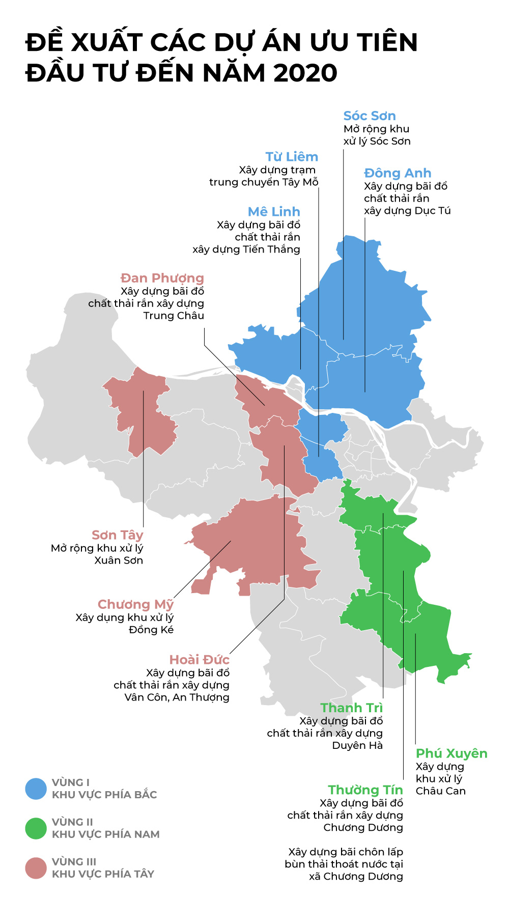 Đáng chú ý, trong đề xuất các dự án đầu tư ưu tiên đến năm 2020 theo quy hoạch, có tới tám bãi đổ chất thải rắn được xây dựng tại các huyện: Đông Anh, Thường Tín, Hoài Đức, Mê Linh, Đan Phượng, Từ Liêm.